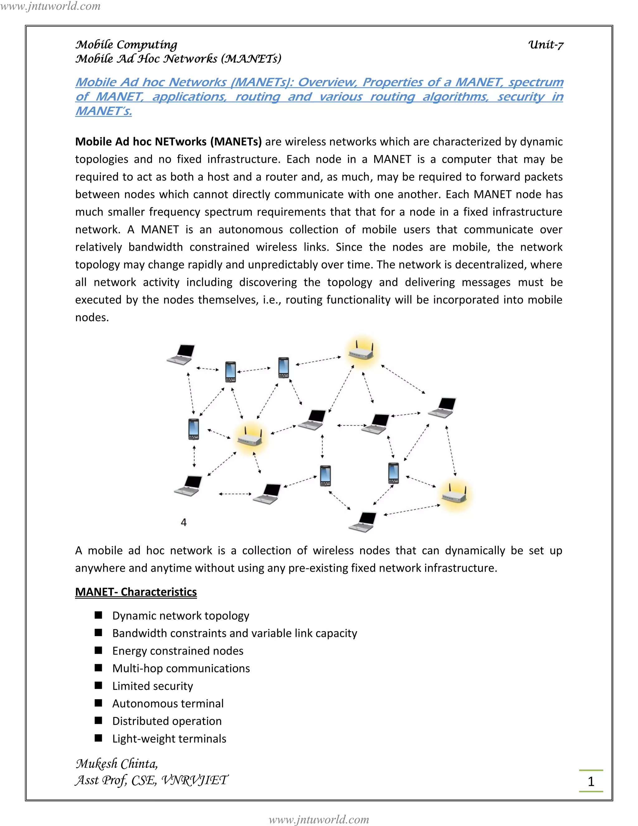 Mobile ad hoc networks (MANETs) are wireless networks without a fixed infrastructure. Each node acts as both a host and a router, forwarding packets for other nodes. Routing in MANETs is challenging due to the dynamic topology from node mobility. Common routing protocols for MANETs include proactive (table-driven) protocols that maintain up-to-date routing tables and reactive (on-demand) protocols that find routes only when needed to limit overhead. Dynamic Source Routing (DSR) is a reactive routing protocol that uses source routing, where the data packet carries the complete hop-by-hop route to the destination.