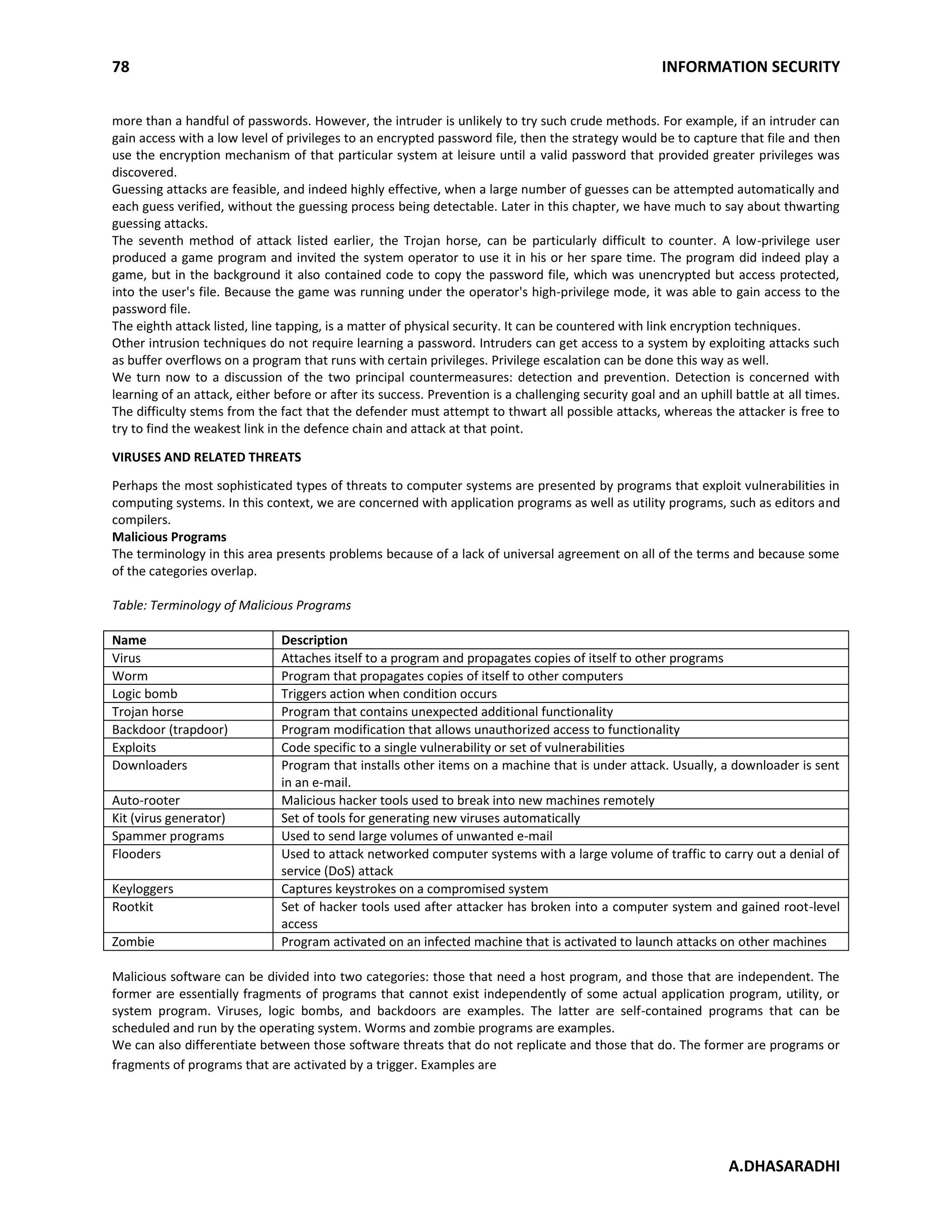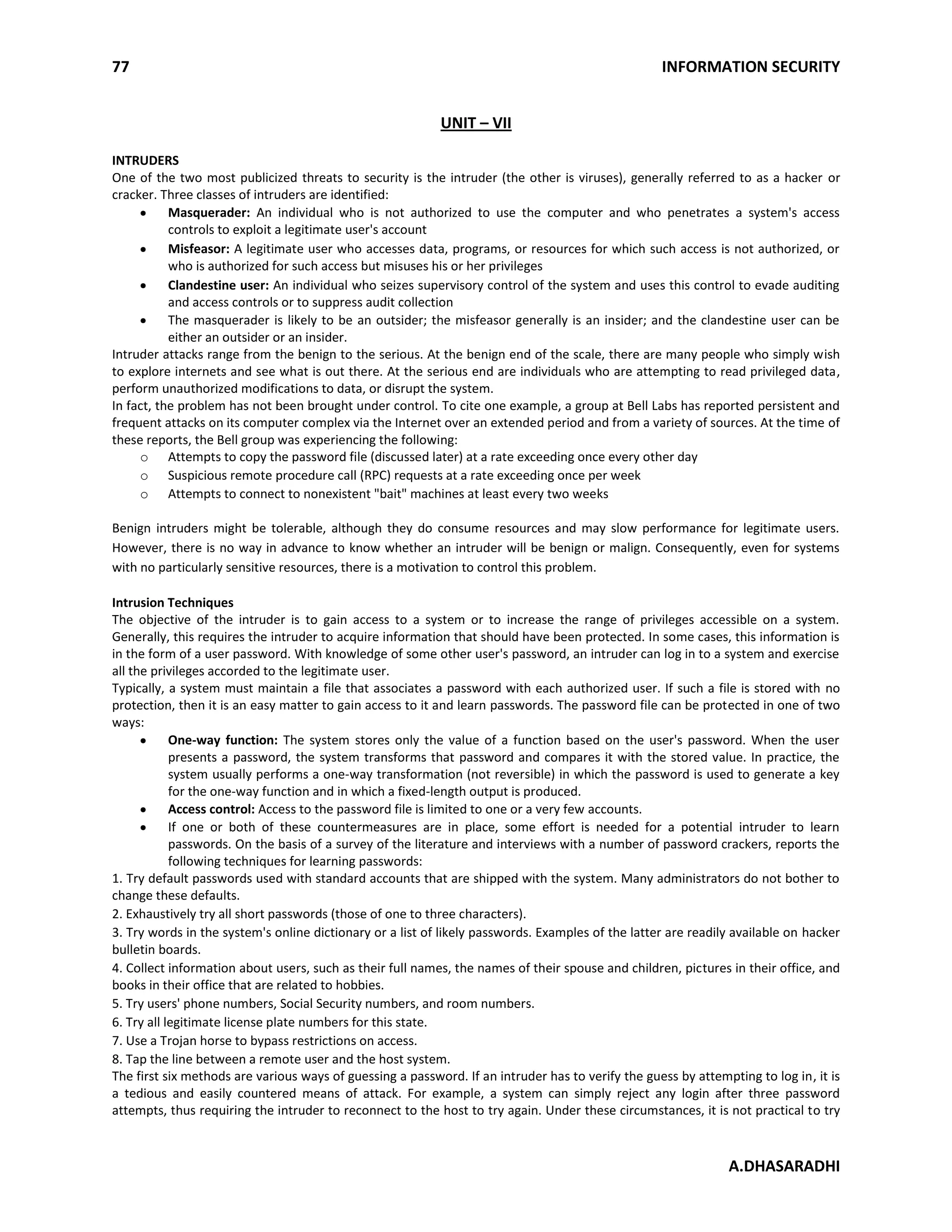Intruders threaten computer security and are classified as masqueraders, misfeasors, or clandestine users. Intruder attacks range from benign to serious, seeking unauthorized access, data modification, or system disruption. A persistent problem is frequent attacks on computer systems via the internet from various sources, including attempts to copy password files, suspicious remote procedure calls, and attempts to connect to nonexistent machines. Intruders aim to gain access or privileges by techniques like guessing default passwords, short passwords in dictionaries, or personal information, or using Trojan horses or line tapping to bypass access controls. Malicious programs also threaten security and are classified based on behaviors like attaching to programs to propagate (viruses), propagating