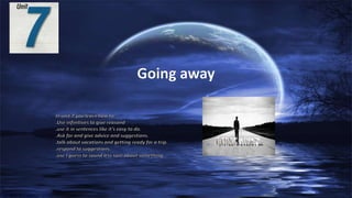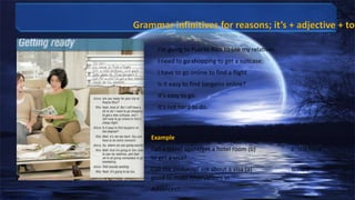 The document discusses a trip to Puerto Rico to visit relatives where the author needs to go shopping for a suitcase and find a flight online. It notes that it's easy to find flights and travel online as well as in person by calling a travel agent or embassy. Examples are provided of necessary items like repellent, a flashlight, and warm clothes as well as unnecessary items like a hair dryer for the trip.