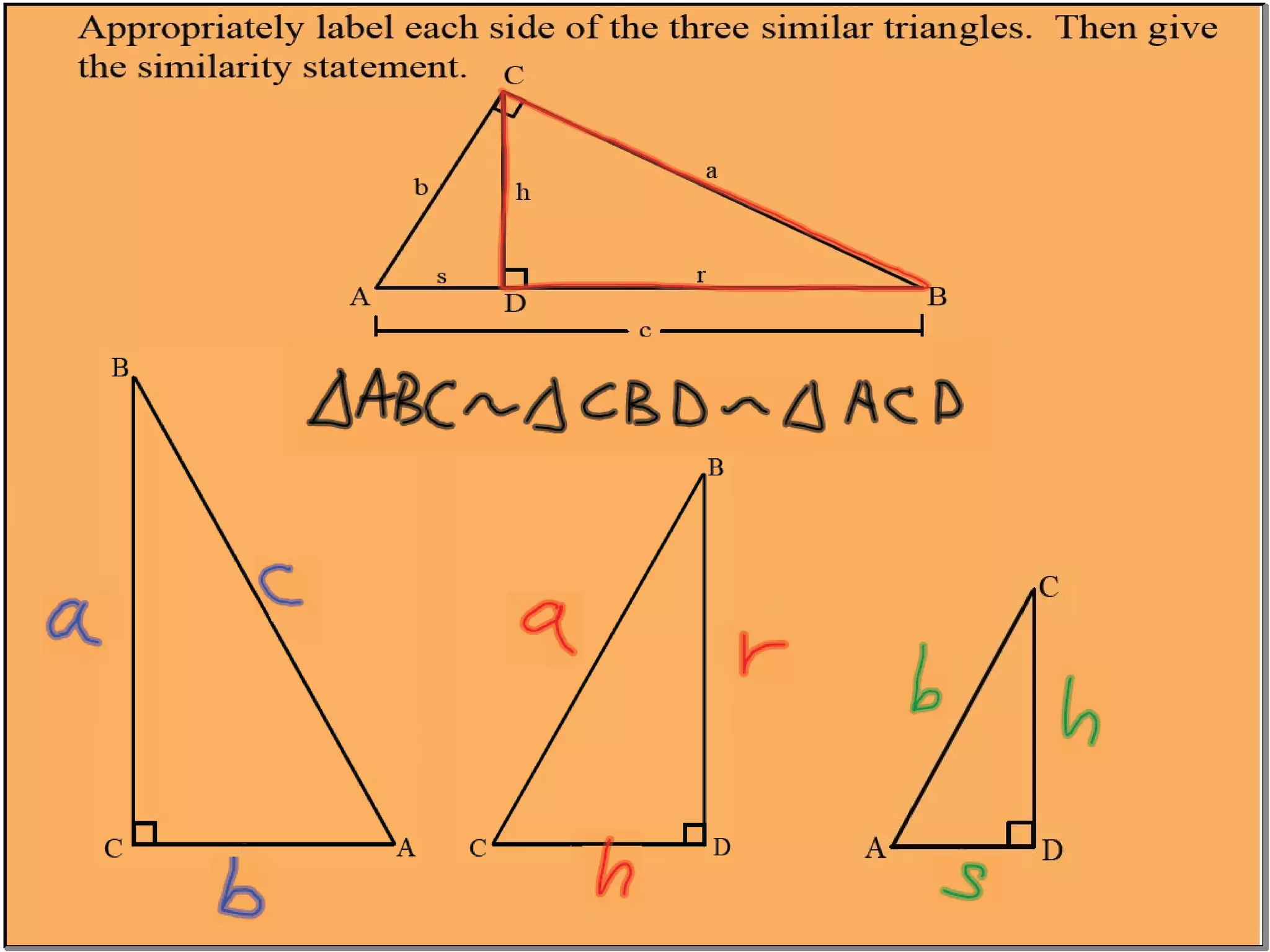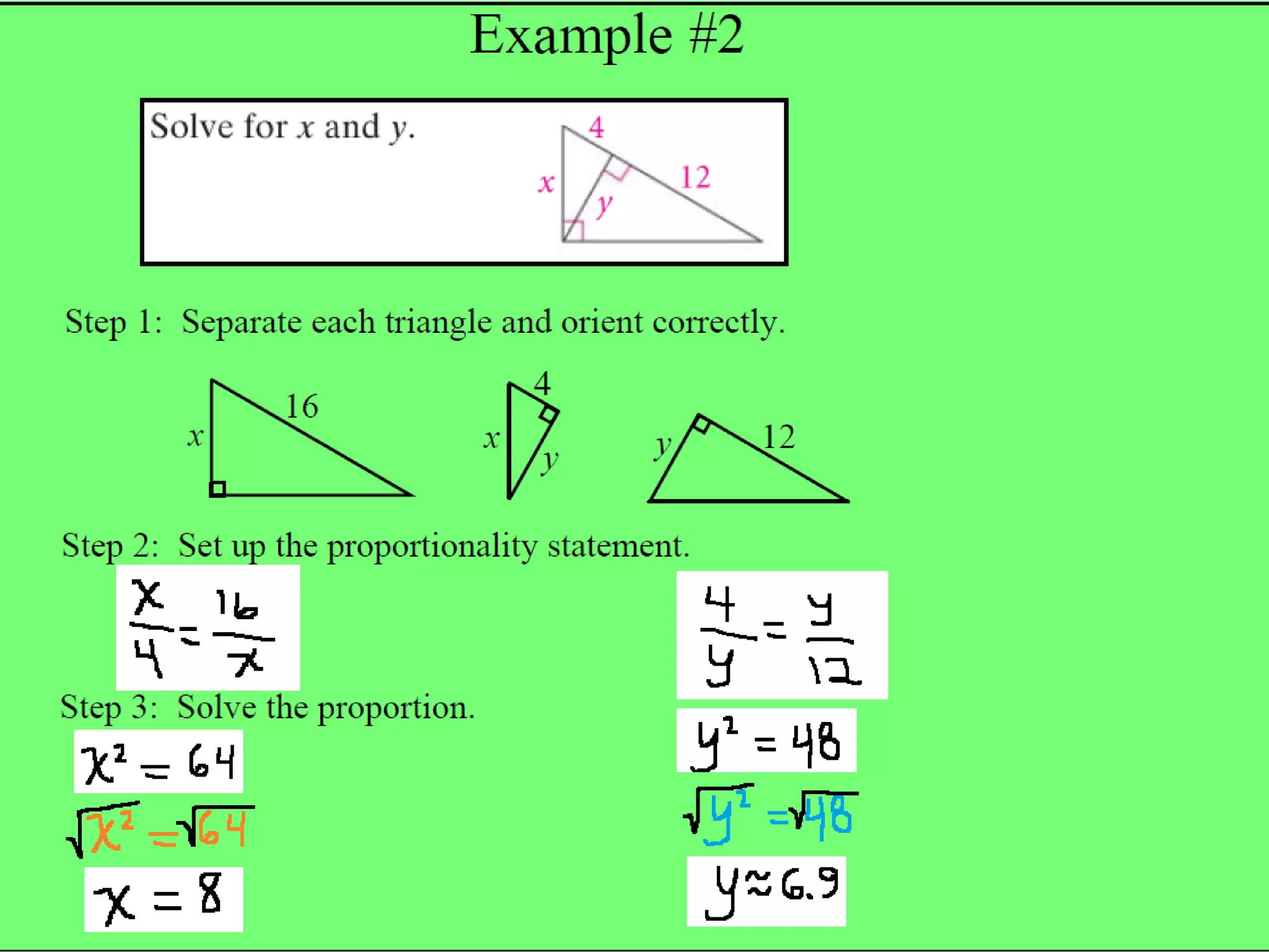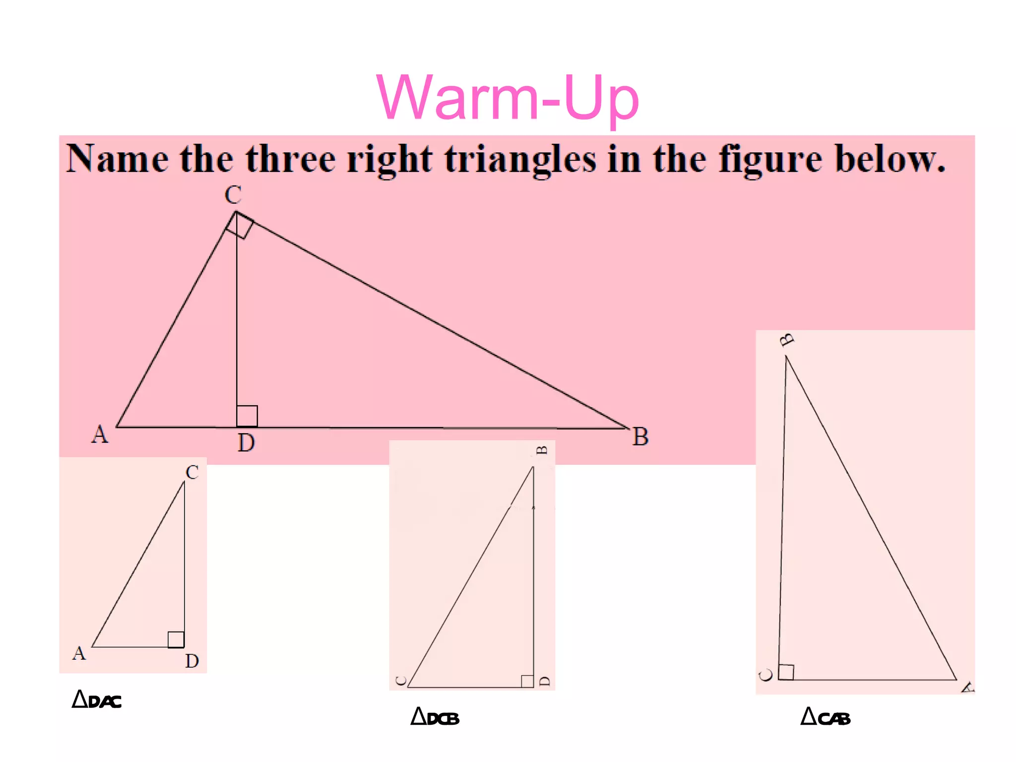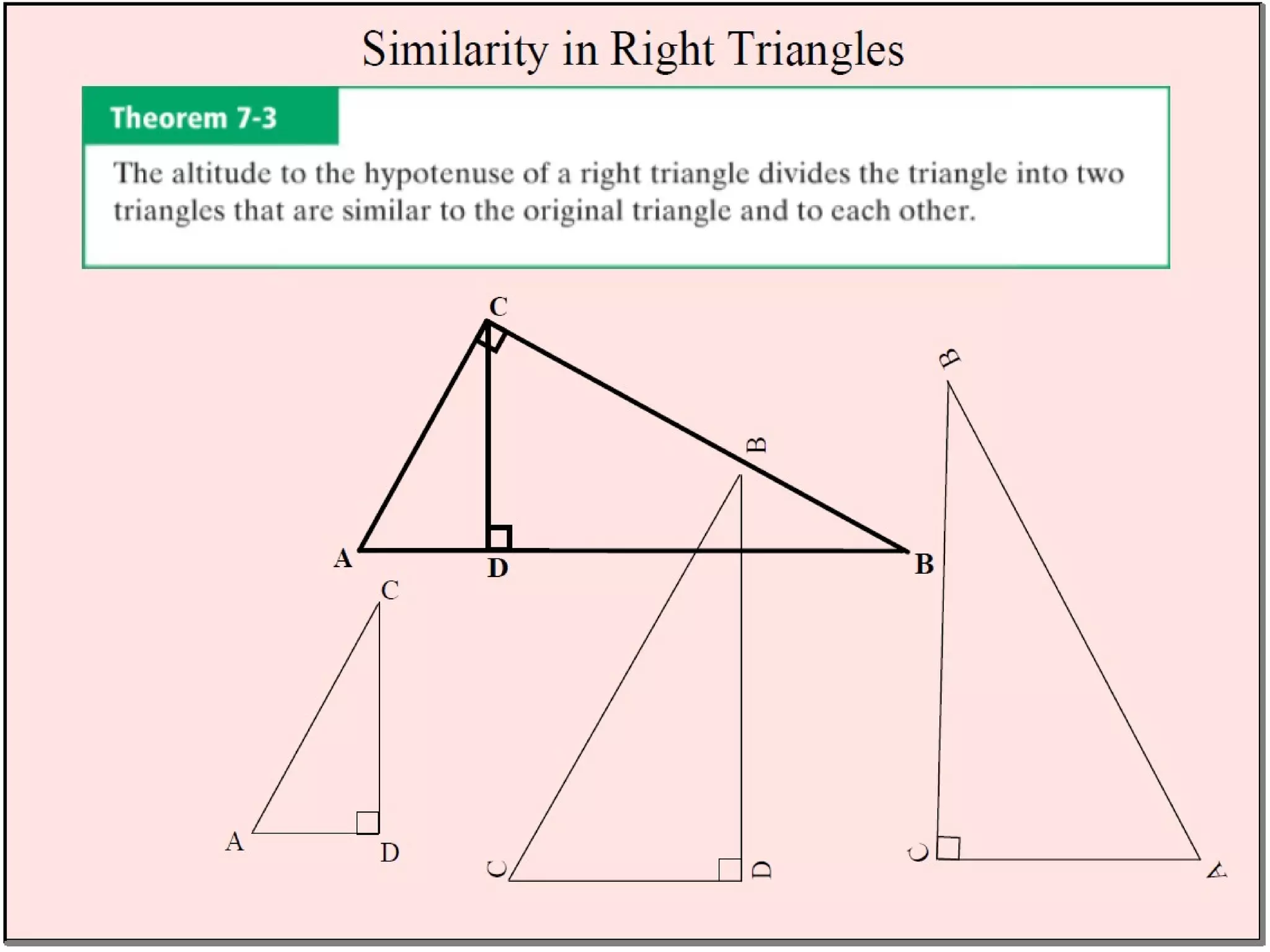 This document provides instruction on similarity in right triangles. It defines similarity and introduces Theorem 7-3, which states that if two right triangles have corresponding angles that are congruent, then the triangles are similar. The document also presents two corollaries to Theorem 7-3: 1) the length of the altitude to the hypotenuse is the geometric mean of the hypotenuse segments, and 2) the length of each leg is the geometric mean of the hypotenuse and adjacent hypotenuse segment. Examples are provided to illustrate the corollaries. The document concludes with practice problems finding geometric means and identifying corresponding parts of similar right triangles.