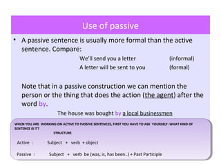 The document discusses the use of passive voice and infinitive clauses. It provides examples of active and passive sentences, how to form the passive in different tenses, and how to use prepositions in passive constructions. It also gives examples of infinitive clauses and phrases using the structure of (way) + infinitive + is/are + infinitive. There are exercises for the reader to practice changing sentences between active and passive voice and providing solutions to problems using infinitive clauses.
