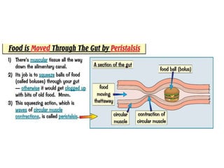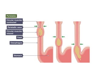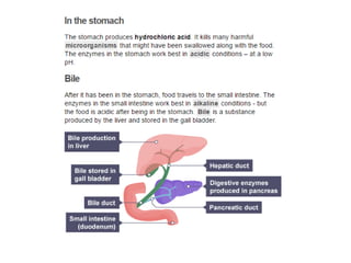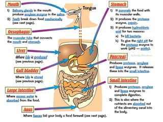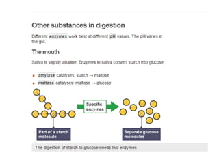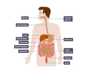 The document discusses the process of digestion. It begins with an overview of the alimentary canal and its parts, including the mouth, esophagus, stomach, small intestine, large intestine, and anus. It then covers the stages of digestion - ingestion, digestion, absorption, assimilation, and egestion. Specific topics covered include the roles and locations of enzymes in breaking down food, as well as the functions of organs like the liver, gallbladder and pancreas in digestion.