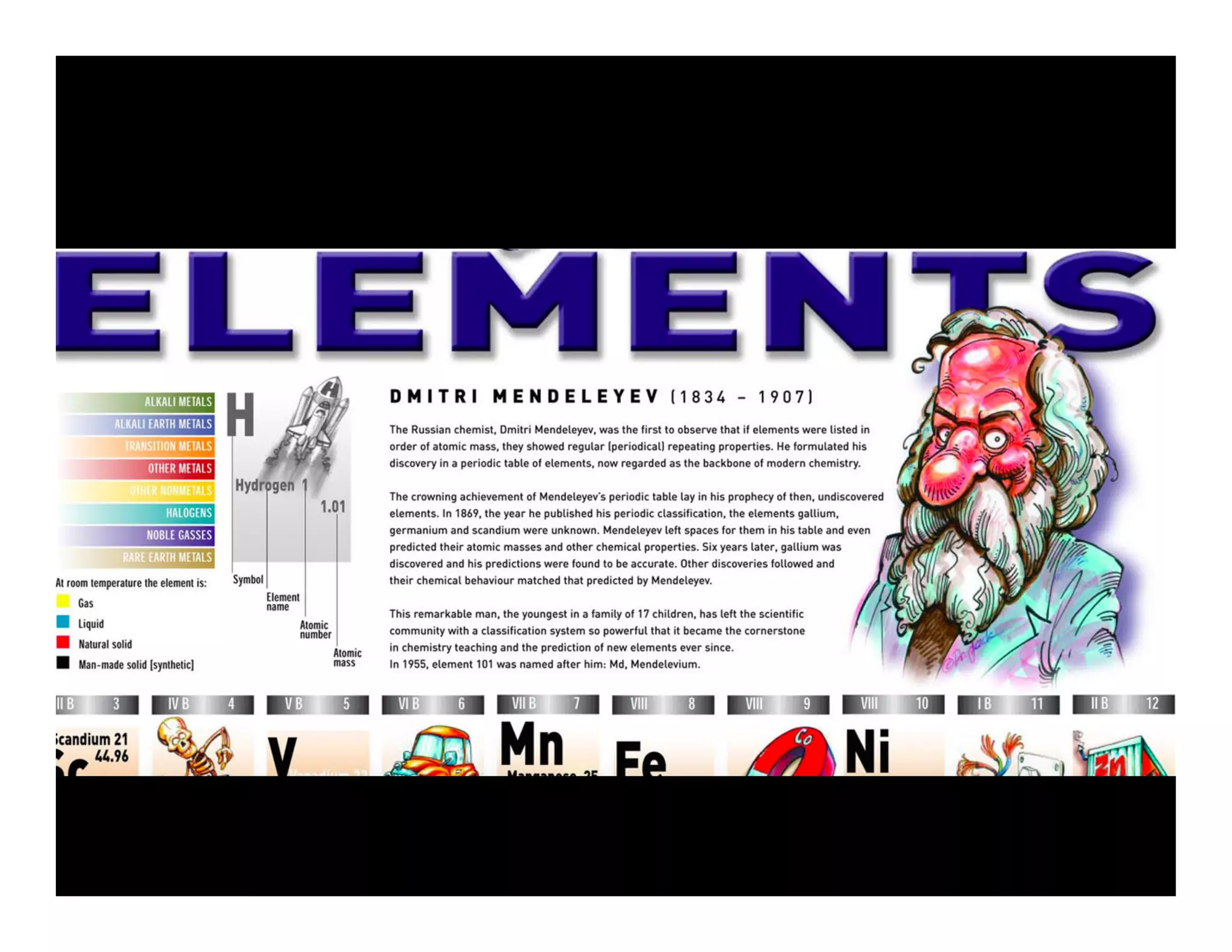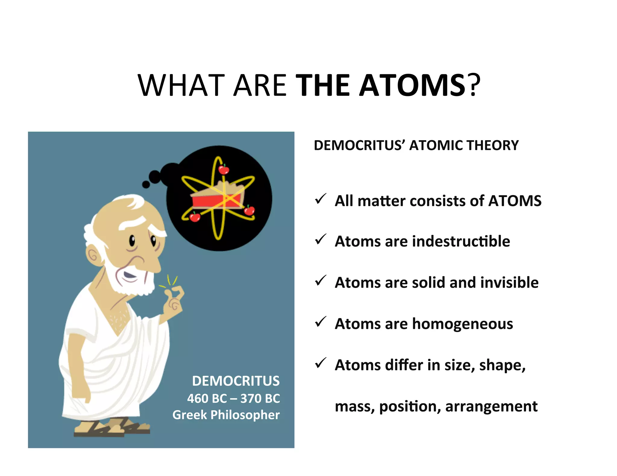 This document provides an overview of atomic theory and the elements. It defines atoms as indestructible particles that make up all matter and can differ in size, shape, mass and arrangement. Atoms of the same type form elements, which are represented by symbols and cannot be broken down further. There are 118 known elements, with 94 found naturally. The periodic table arranges elements in rows and columns based on atomic number and properties. Common questions are provided to help students learn about atoms and the first 20 elements.