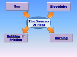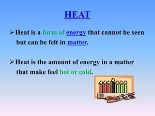 This document discusses heat and temperature. It defines heat as a form of energy that cannot be seen but can be felt, and temperature as a measurement of how hot or cold something is. It describes different types of thermometers used to measure temperature, such as mercury and alcohol thermometers, and explains how to correctly measure temperature using a thermometer. An experiment is described where the temperature of water is measured as it is heated and cooled over time, showing that temperature increases with heating as the water gains heat, and decreases with cooling as the water loses heat.