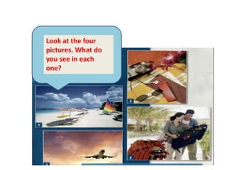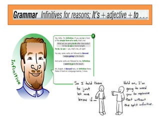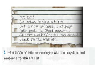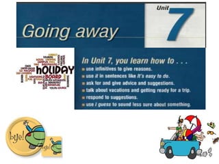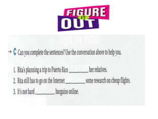 Rita is going on a trip to Puerto Rico. Alicia and Rita discuss what Rita needs to do before her trip, including packing. Rita needs to pack things like clothes, toiletries, and a swimsuit. On her trip, Rita plans to go to the beach and visit old friends. The lesson then discusses using the infinitive of purpose with "to" to explain why someone does something. Examples are provided like "I phoned Harry to invite him to dinner."