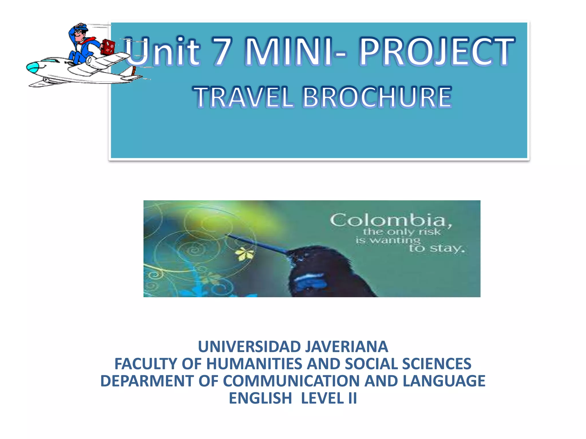 This document provides instructions for creating a travel brochure to promote an interesting destination. It lists various elements that should be included in the brochure such as an attractive cover, benefits of visiting the place, prices, location map, facts about the destination's climate, culture, places of interest, currency and other practical travel information. Students are asked to work in groups to research and design a brochure advertising their chosen destination. The document provides online resources and rubrics for grading the brochures based on elements like teamwork, organization, topics covered, creativity and oral presentation.