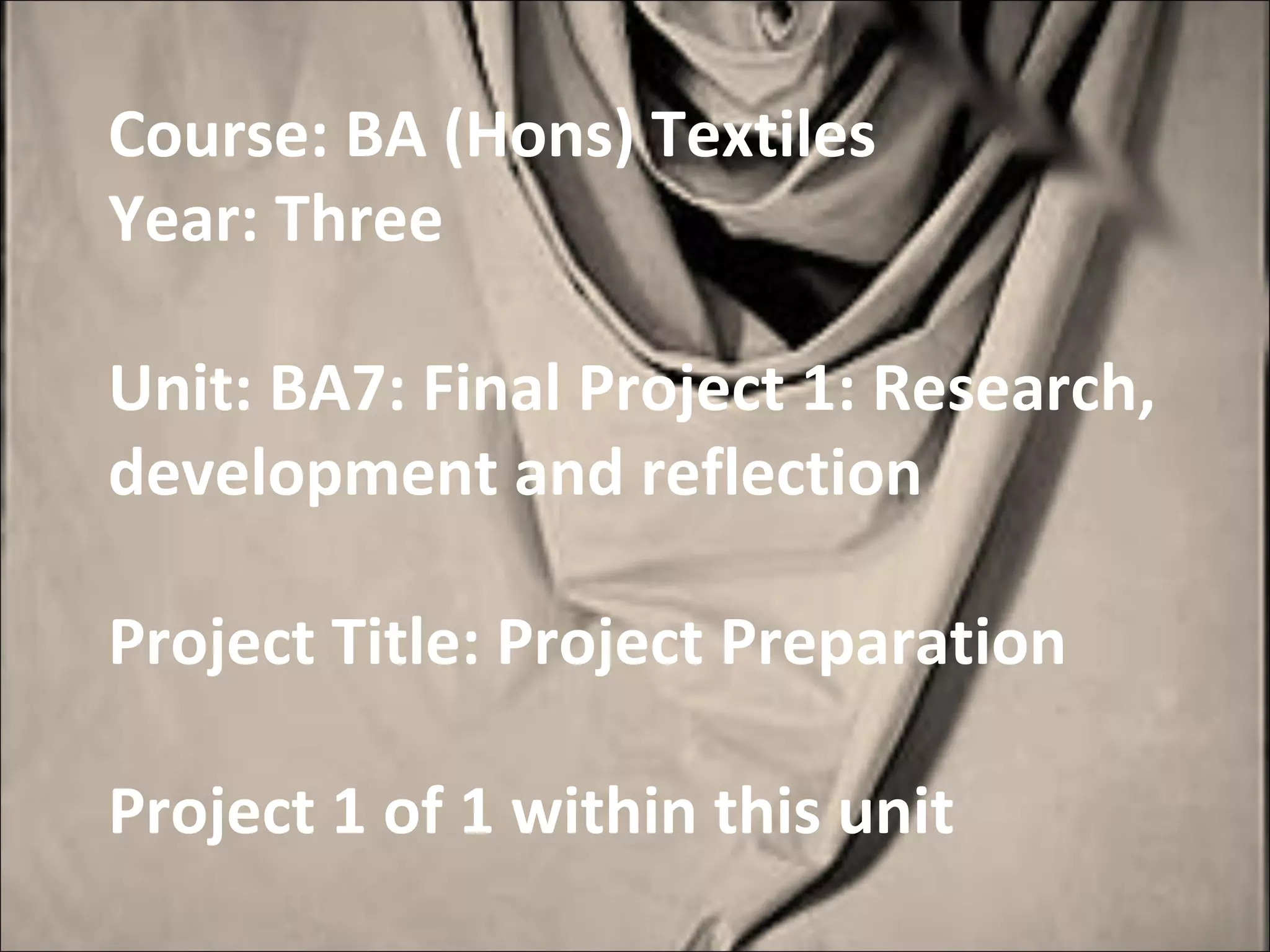 This document provides guidance for a BA (Hons) Textiles final year project unit focusing on preparing students to plan, research, develop and organize their final projects through developing a learning agreement, studio practice experimentation, and a research report on a topic related to their practice in textiles in order to address key learning outcomes in studio practice, business skills, and contextual studies. Assessment will include evaluating students' learning agreements, bodies of studio work, research files, reflective journals, and draft research reports.