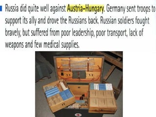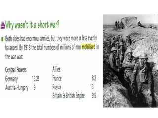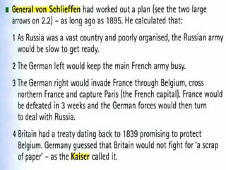 The document provides background information on the main powers in Europe prior to World War 1, including Britain, France, Russia, Austria-Hungary and Germany. It describes their overseas empires, political situations, alliances and rivalries. It then outlines some of the key events that increased tensions between the powers and ultimately led to the outbreak of World War 1 in 1914.