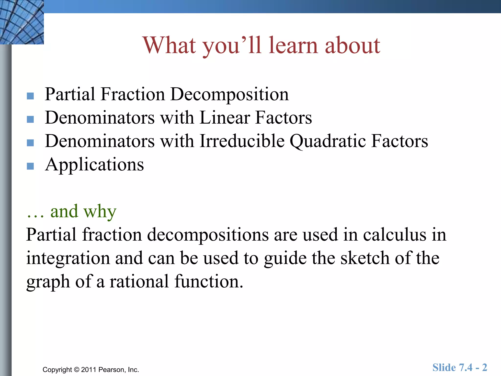 Partial fraction decomposition involves writing rational functions as the sum of simpler fractional components. It is useful for integration in calculus. A rational function is broken into partial fractions by factoring the denominator and grouping terms with each linear or irreducible quadratic factor. Examples demonstrate decomposing fractions with linear factors and repeated or quadratic factors. Partial fraction decomposition allows rational functions to be integrated and graphs of rational functions to be sketched.