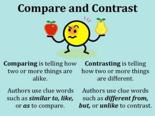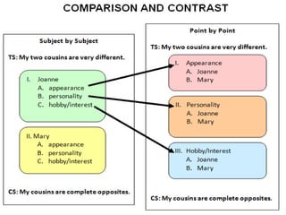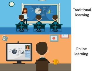 This document provides information and guidance for writing a comparison essay about online learning versus traditional learning. It defines key terms related to online and traditional learning and lists aspects to compare, such as time and place, learning materials, and pace. The document also outlines the structure of comparison essays using point-by-point and block organization methods and provides examples of thesis statements.