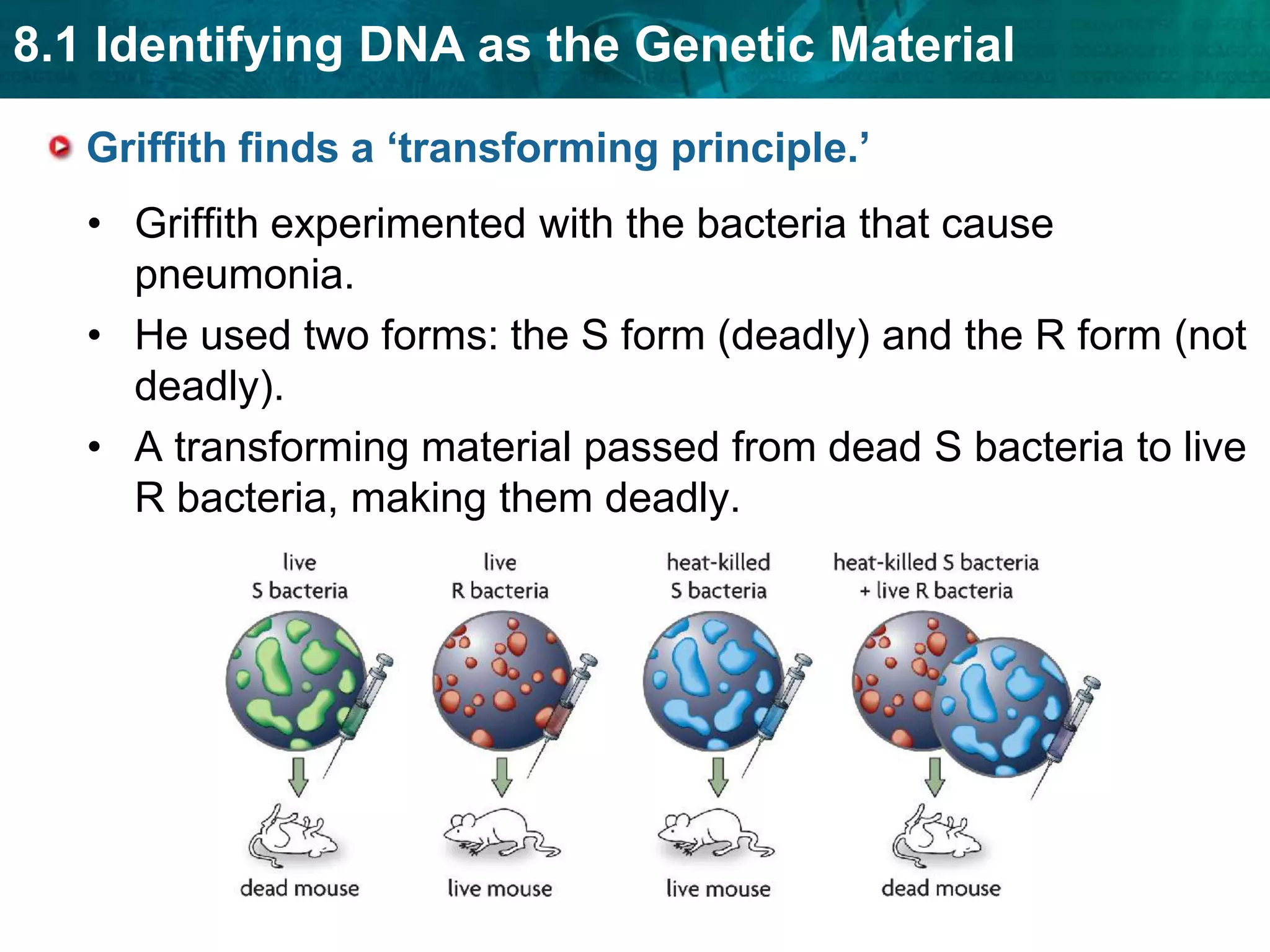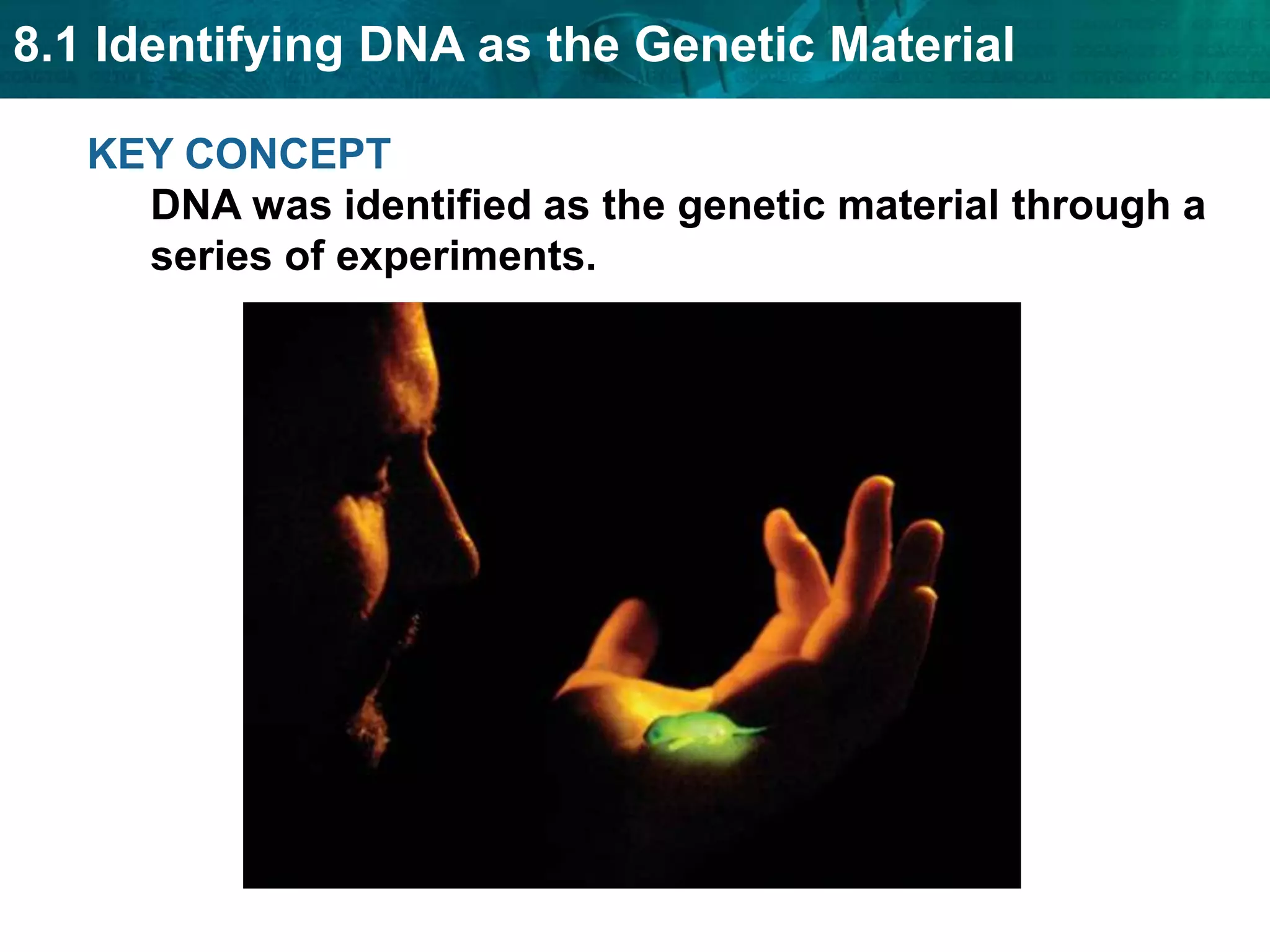 DNA was identified as the genetic material through a series of experiments. Griffith found that a transforming principle in dead bacteria could make live bacteria deadly. Avery purified this principle and identified it as DNA through chemical and enzyme tests. Hershey and Chase showed that viral DNA, not proteins, entered bacteria during infection. Watson and Crick determined that DNA is a double helix with nucleotides pairing according to base pairing rules. DNA replication copies genetic information by unwinding the DNA helix and using it as a template to produce two identical DNA molecules. Transcription produces RNA copies of genes which then direct protein production.