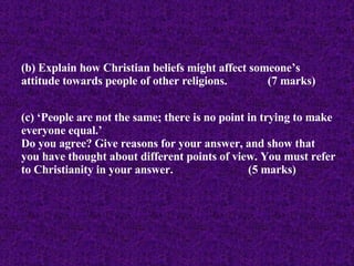The document discusses Christian beliefs around attitudes towards other religions and equality. It notes that Christians may have different views, from believing there is only one route to God through Jesus, to believing that other faiths worship the same God. While people are different, Christianity teaches that all are equal in God's eyes. The document explores how Christian teachings have been both for and against discrimination and promoting equality, depending on interpretation.