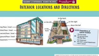 This document provides instructions for navigating a mall or department store. It discusses interior locations and directions, and includes practice exercises. The key information covered includes understanding store layouts, reading signs and maps to find specific shops or areas, and practicing following directions within a simulated shopping environment.