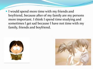 The author would like to spend more time with friends, family, and their boyfriend as those relationships are most important. Currently, the author spends a lot of time studying which makes them sad for lack of social interaction. They would also like to be less serious in their relationship and enjoy fun activities together like playing tennis or studying medicine which they find exciting.