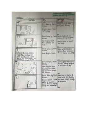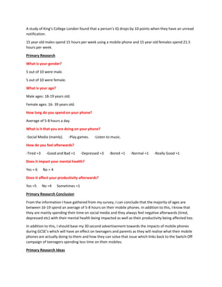 The document provides details about creating a media campaign for the organization Switch Off. It discusses targeting 14-18 year olds to encourage reduced screen time. Primary research found that teens spend 5-8 hours on phones daily and usually feel negative afterwards. The proposed product is a 30-second video called "Isolated" comparing the impacts of high vs low phone use, showing exam stress. It will cut between scenes of a revising student and one constantly on their phone. Facts will pop up to further explain impacts. The goal is to open teens' and parents' eyes to the negative effects of excessive phone use on mental health, education, and life goals.
