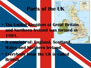 The United Kingdom consists of England, Scotland, Wales, and Northern Ireland. England has over 50 million people and is mostly urbanized, though it has rural coastal areas. Scotland's capital is Edinburgh and it has over 5 million people divided between the mountainous Highlands and more populated Lowlands. Wales has a population of over 3 million and its economy relies on mining and metal production. Northern Ireland has just under 2 million people and Belfast is its largest city located in the eastern coastal region.
