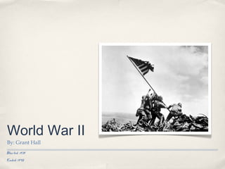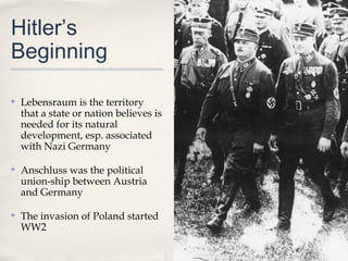 World War II lasted from 1939 to 1945. It began when Hitler invaded Poland after taking control of Germany and annexing Austria. Germany formed an alliance with Italy and Japan called the Axis Powers, while the Allies included the Soviet Union, United Kingdom, United States, China, France and others. The war was defined by Germany's use of "Blitzkrieg" warfare and air power from the Luftwaffe.