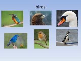 This document discusses different types of animals including birds mentioned multiple times, reptiles mentioned a few times, and insects mentioned several times. Birds, reptiles, and insects are the main animal groups covered at a high level in the short document.