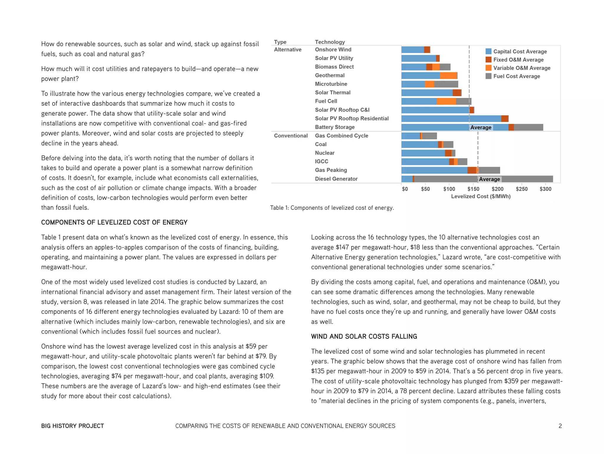 The document discusses the cost comparison between renewable energy sources, like solar and wind, and conventional fossil fuels, revealing that utility-scale solar and wind have become competitive with coal and natural gas. It highlights that the levelized cost of wind has fallen significantly and is projected to continue decreasing, while the costs of various technologies are affected by factors such as construction, fuel, and operational expenses. Additionally, the analysis emphasizes the potential long-term advantages of low-carbon technologies when considering external costs such as pollution and climate change.