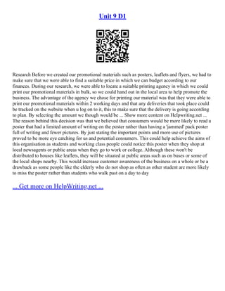 The document discusses research done before creating promotional materials like posters, leaflets, and flyers for a business. It explains that a suitable printing agency was found that could print materials in bulk within 2 days of ordering and track deliveries online. The promotional materials were designed with limited text and more pictures to be eye-catching for potential customers.
