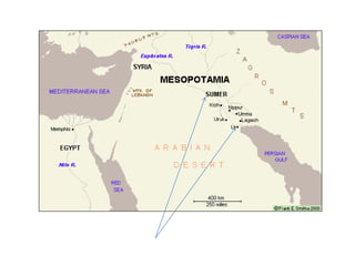 This document provides an overview of early civilizations and Mesopotamian and Egyptian civilization. It discusses the first civilizations emerging around 5000 years ago along major rivers like the Tigris, Euphrates, Nile, Yellow River, and Indus River. Mesopotamian civilization was the first to develop writing in around 3000 BC, with cuneiform writing on clay tablets. Egyptian civilization emerged along the Nile River, with the annual flooding providing fertile land. Powerful pharaoh kings ruled ancient Egypt, and religion was important for ensuring order. Both civilizations had hierarchical societies divided between elites and commoners. Mesopotamian and Egyptian art served religious and political functions through temples, statues