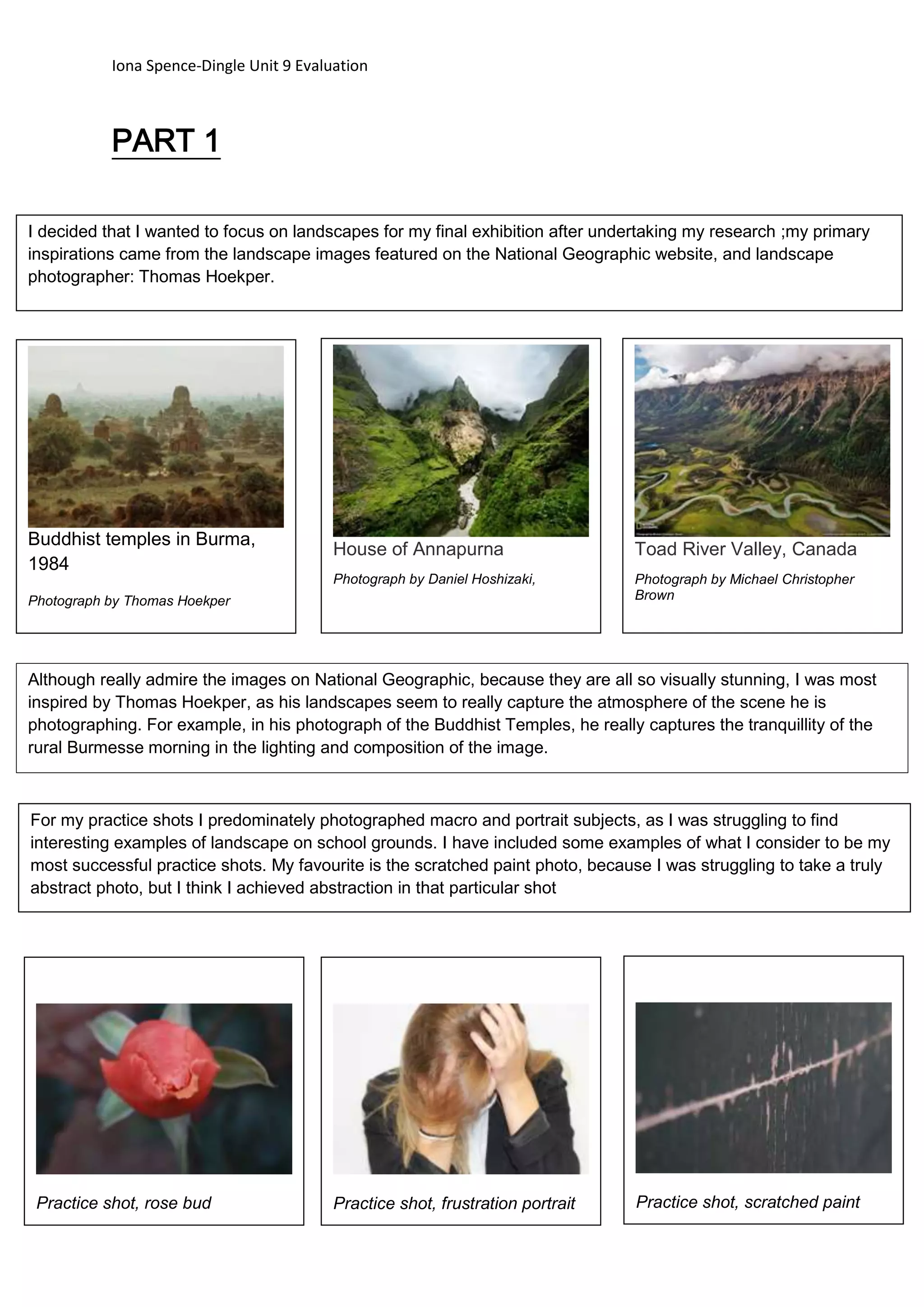 Iona focused her final exhibition on landscapes after being inspired by images on National Geographic and the work of photographer Thomas Hoekper. For practice, she photographed macro and portrait subjects on her school grounds. Her favorite practice shot was of scratched paint, which achieved an abstract effect. She then narrowed her exhibition theme to horizons, collecting example images. Her final photographs were of horizons that she edited in Photoshop to highlight colors and adjust exposure. Feedback noted the improvements from editing and suggested considering borders and arrangement for future presentations.
