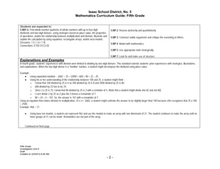 This document outlines a fifth grade mathematics curriculum guide from the Isaac School District. Unit 9 focuses on data analysis and probability. Students will understand probability, how it can be represented, and how mathematical methods can maximize efficiency. They will learn to fluently multiply multi-digit numbers, find quotients of whole numbers with up to four-digit dividends and two-digit divisors, and make and interpret line plots displaying fractional data. Examples are provided to illustrate different strategies and models for solving problems within these domains.