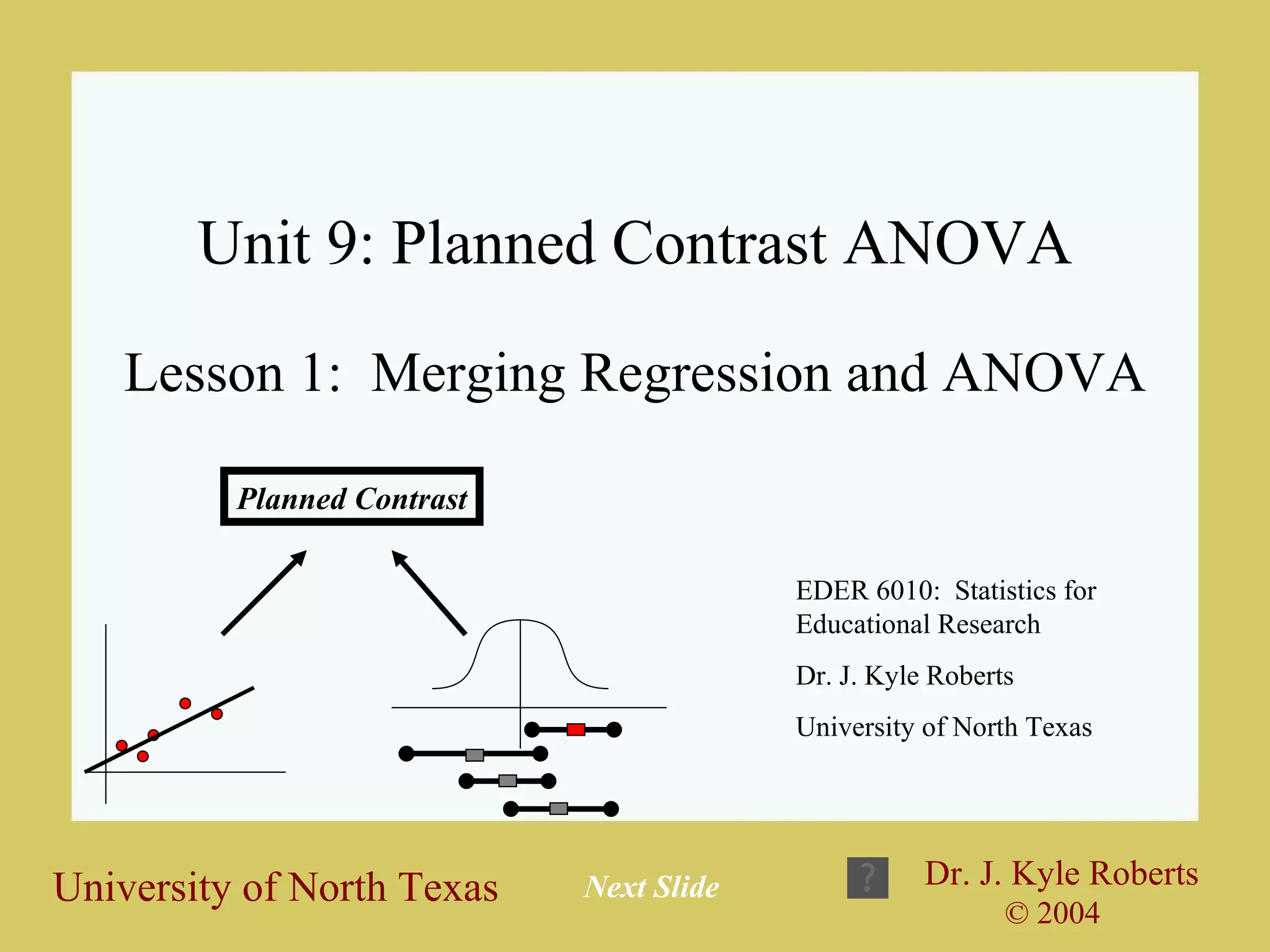 This document discusses planned contrast ANOVA, which allows researchers to test specific hypotheses about group mean differences rather than an overall hypothesis. It provides an example comparing IQ scores of blondes, brunettes and redheads. Researchers can create contrast variables to test the hypotheses that blonde and brunette means equal each other and that blonde and brunette means together equal the redhead mean. Planned contrast ANOVA merges regression and ANOVA techniques to test these focused hypotheses rather than an overall difference in means.