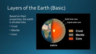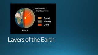 The document lists geographical locations along with their coordinates, including Texas, South Dakota, the Himalayas, South Africa, and Australia. It also outlines various layers of the Earth's structure, such as the continental and oceanic crust, different mantle layers, and core layers. Key terms related to geology are presented, including mohorovicic discontinuity and gutenberg discontinuity.