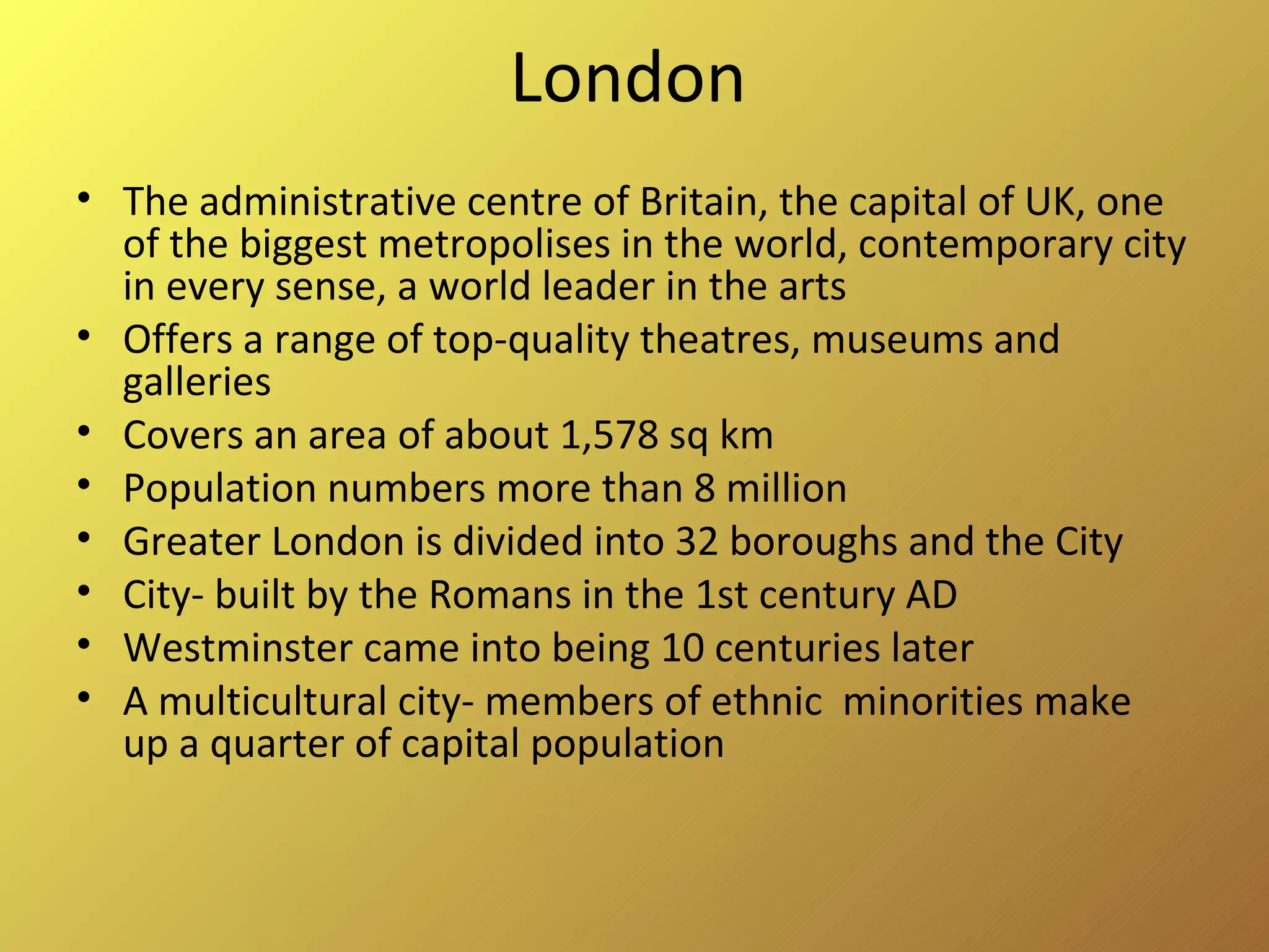 The document provides an overview of the history and attractions of London, England. It discusses the city's establishment by the Romans, growth over the centuries, and status today as one of the world's largest metropolises. Key points include the city being divided into 32 boroughs and the City of London, its multicultural population, and major parks, museums, and landmarks like Buckingham Palace, Big Ben, and the River Thames running through the city.