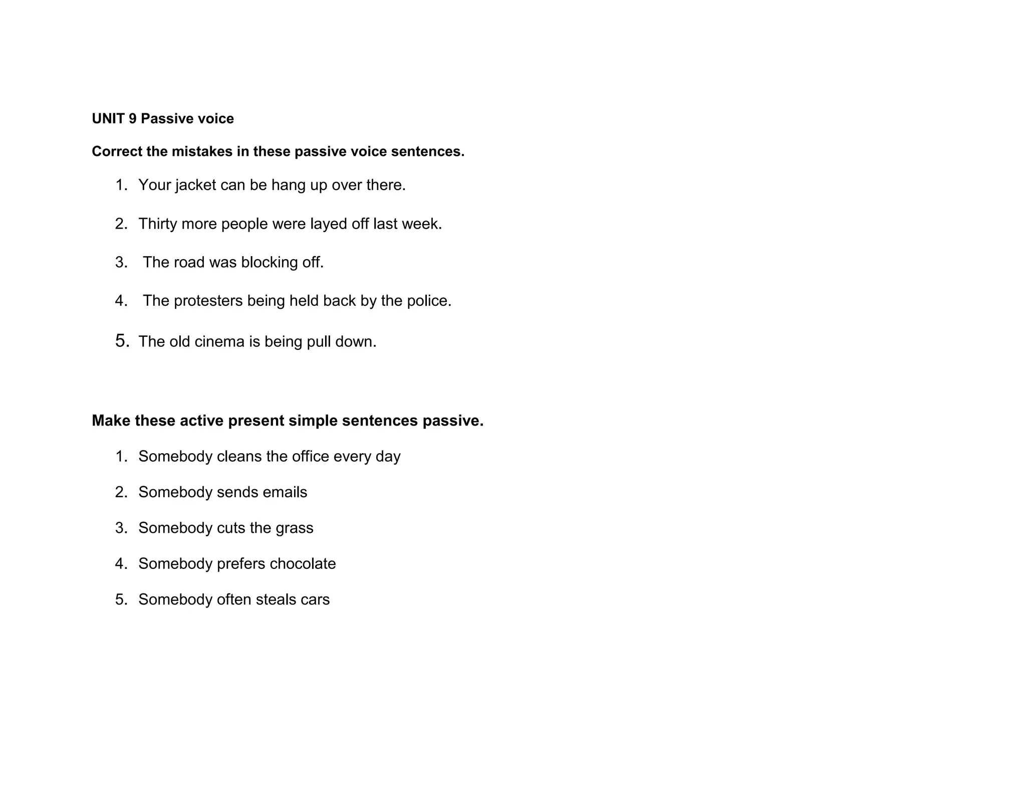 The document provides examples of sentences in the passive voice and asks the reader to either correct mistakes in passive voice sentences or change active sentences to the passive voice. It contains 5 sentences with errors in passive voice construction and asks the reader to fix them, as well as 5 active sentences and asks the reader to change them to the passive voice. The document is focused on demonstrating the proper use of the passive voice through examples.