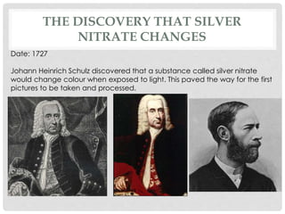 Johann Heinrich Schulz discovered in 1727 that silver nitrate would change color when exposed to light, paving the way for the first photographs. Joseph Niepce developed the camera obscura in 1814 and took the first photo, though it required 8 hours of exposure. In 1837, Louis Daguerre invented the daguerreotype process which reduced the exposure time to just 30 minutes and produced images that did not fade over time. William Henry Talbot then developed the calotype process in 1841, allowing for multiple copies of photographs.