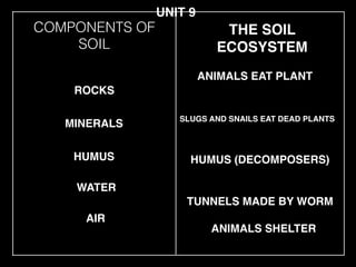 This document discusses different types of soil layers including topsoil, subsoil, and bedrock. It describes components of soil like minerals, humus, rocks, and how animals and decomposers interact with soil and plants. Different types of rocks that make up soils are also mentioned.