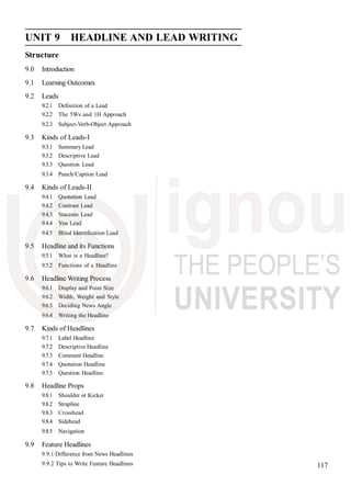 This document discusses different types of leads and headlines used in journalism. It covers the definition of a lead, the 5Ws and 1H approach to writing leads, and common lead structures like the summary lead, descriptive lead, question lead, and punch/caption lead. It also discusses the definition and purpose of headlines, the headline writing process, and different headline types. The document is focused on providing guidance to writers on crafting effective leads and headlines for news articles.