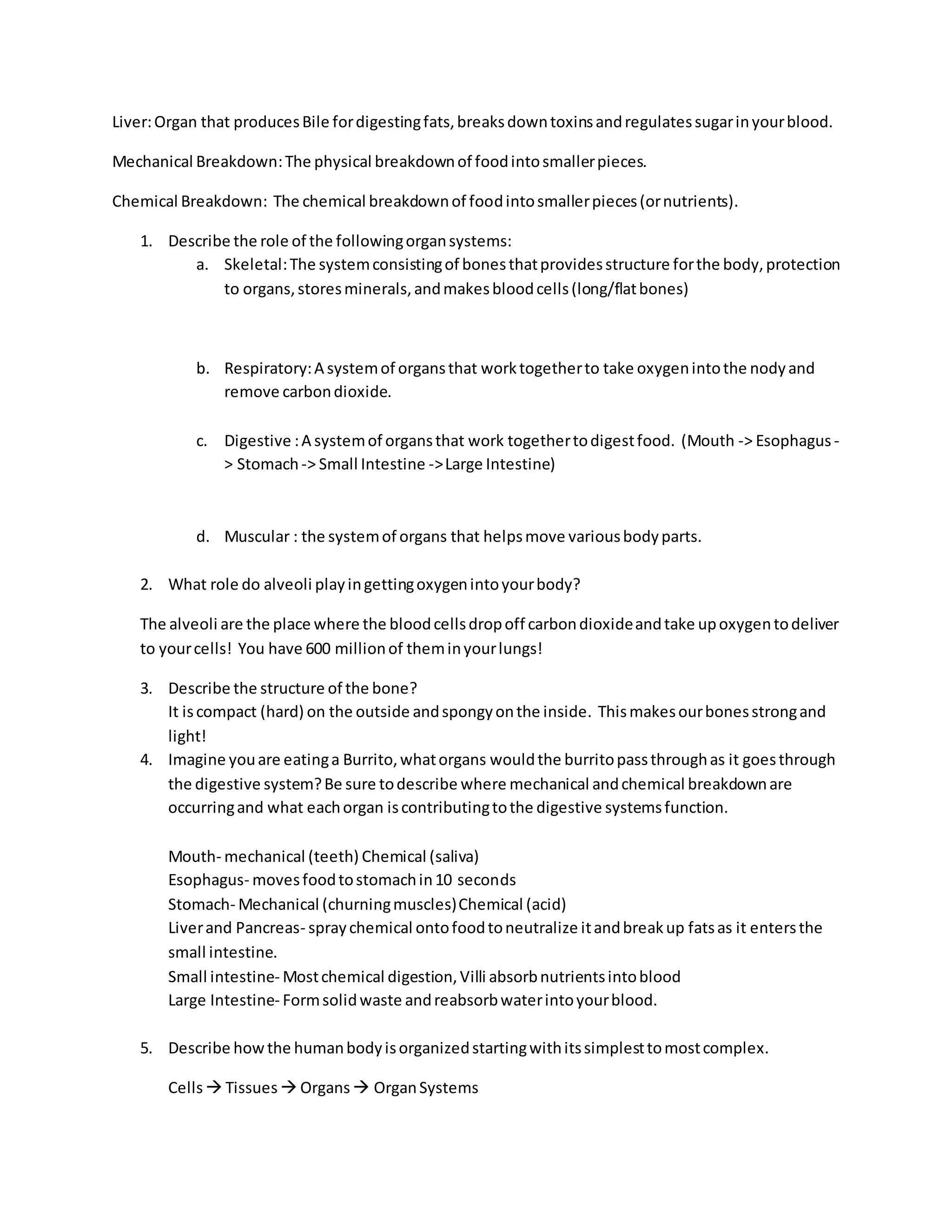 This document provides a review sheet for a body works unit test. It includes definitions of key vocabulary terms like hypothesis, sensory neuron, and mean. It also describes the roles and functions of major body systems and organs related to digestion, respiration, and movement. Examples given include that the alveoli in the lungs are where gas exchange occurs and that the mouth, esophagus, stomach, intestines, and liver all play a part in digesting a burrito. The review sheet also addresses the structure of bones, types of muscles, and how muscles and bones work together through joints and tendons.