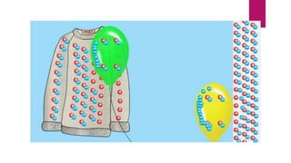 The document discusses static electricity and electrical charge. It explains that static electricity is a build up of electrons on a surface that are not moving. Electrical charge can cause attraction or repulsion depending on whether charges are opposite or like. Electrical discharge occurs when a build up of electrons moves between objects. A larger separation of charges results in a larger electrical discharge, such as from lightning versus a small carpet shock. A Van de Graaff generator is used to demonstrate building up a static charge by rubbing a belt on a wire brush.