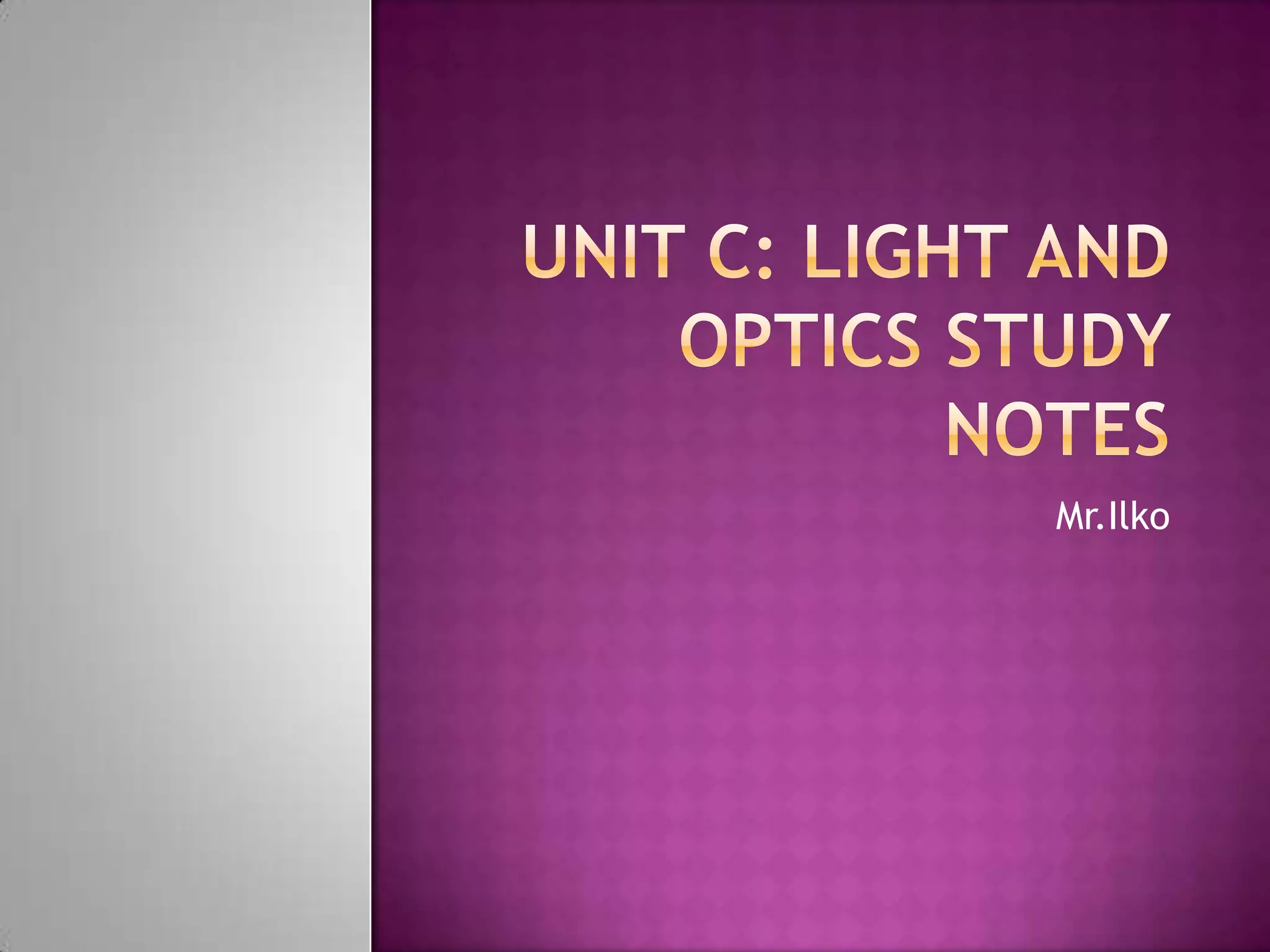This document defines and describes key optical terms and concepts. It explains the differences between concave and convex lenses and mirrors, and how they bend and focus light. It also defines transparency, reflection, bioluminescence, and the parts of the eye. Various light properties and production methods are outlined as well, including amplitude, wavelength, frequency, fluorescence, and the electromagnetic spectrum.