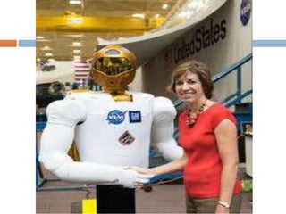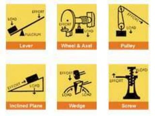 This document discusses mechanical systems and simple machines. It explores how mechanical systems have improved lives through vehicles, medicine, and resource gathering. Some key contributions discussed are the Canadarm on the International Space Station and Robonaut, the first robot astronaut. The document then covers the six main simple machines: lever, inclined plane, wedge, screw, pulley, and wheel and axle. Each machine is defined and an example of its use is provided.