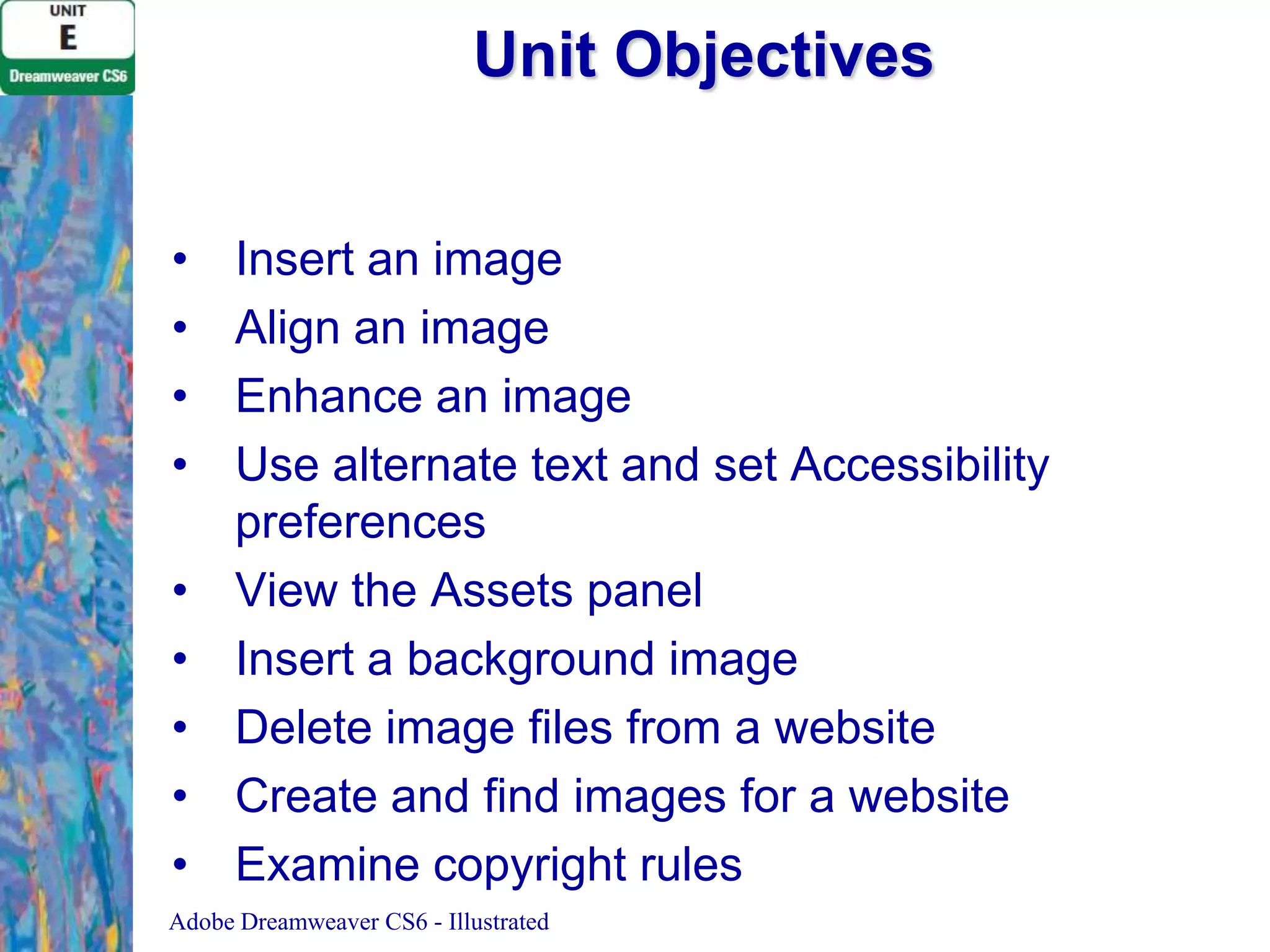 The document discusses various techniques for working with images in Adobe Dreamweaver, including inserting, aligning, and enhancing images; setting alternate text and accessibility preferences; using the Assets panel; inserting background images; deleting image files; creating and finding images; and examining copyright rules. The step-by-step instructions demonstrate how to perform tasks like floating images left and right, adding borders and spacing, and viewing the assets used on a website.