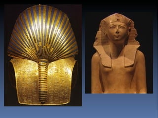 Ancient Egypt was located in the fertile valley of the Nile River in Northeast Africa. The Nile provided water for irrigation and transportation, enabling the rise of the Egyptian civilization. Egyptian society was highly stratified, with pharaohs and nobles at the top. Farming and trade supported the population, and complex irrigation systems were developed. The Egyptian religion was polytheistic, with many gods represented with animal heads. After death, people faced judgment by Osiris to determine if they could reach the afterlife.