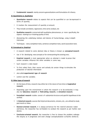 3) The main types of research including descriptive vs analytical, applied vs fundamental, quantitative vs qualitative, and conceptual vs empirical.
