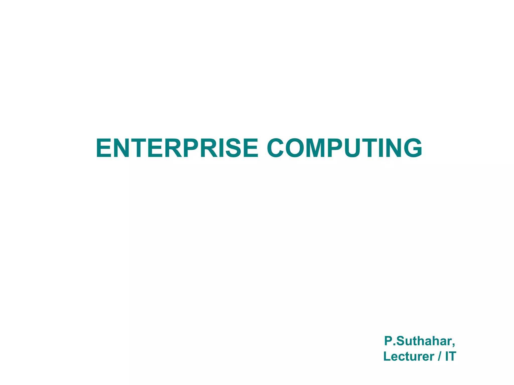 The document provides an overview of enterprise computing and its key components from an object-oriented perspective. It discusses enterprise architectural concepts like the enterprise, enterprise components, and the role of information technology. It then covers various enterprise-enabling technologies like enterprise user interfacing, data enabling, distributed communications, common services, systems assurance, and web enabling. Finally, it discusses object-oriented software development for the enterprise using concepts like enterprise objects, the development process, the unified modeling language, and component-based development standards.