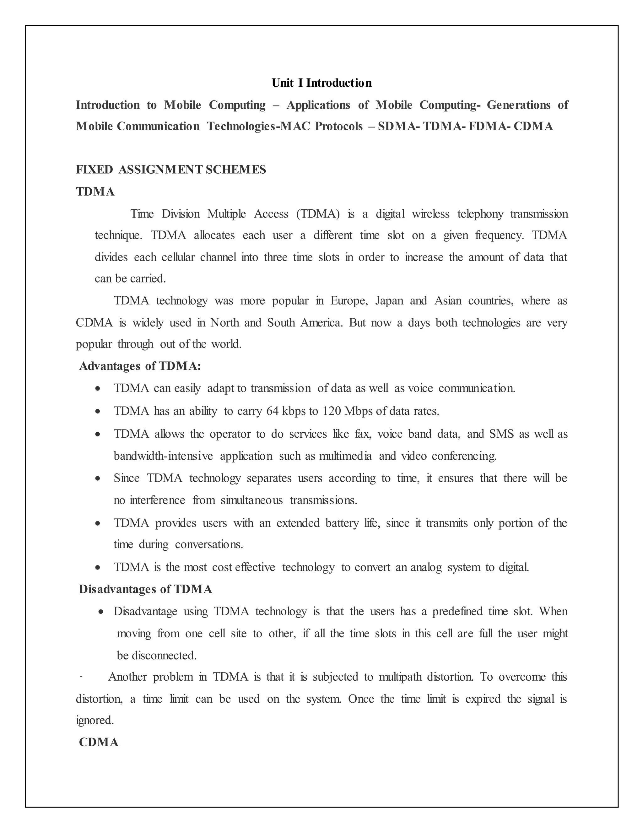 TDMA, CDMA, FDMA, and SDMA are different multiple access techniques used in mobile communications. TDMA divides each channel into time slots and allocates slots to different users. CDMA encodes each conversation with a pseudo-random sequence and all users share the full spectrum. FDMA divides the bandwidth into individual frequency bands, each assigned to a single user. SDMA uses smart antennas to create spatial pipes between the base station and mobile users to improve performance.