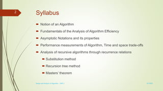 The document provides an introduction to the analysis of algorithms. It discusses key concepts like the definition of an algorithm, properties of algorithms, common computational problems, and basic issues related to algorithms. It also covers algorithm design strategies, fundamental data structures, and the fundamentals of analyzing algorithm efficiency. Examples of algorithms for computing the greatest common divisor and checking for prime numbers are provided to illustrate algorithm design and analysis.
