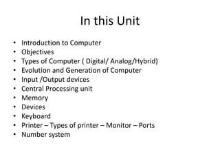 Unit 1 provides an introduction to computers including their objectives, types (digital, analog, hybrid), evolution through generations, core components (CPU, memory, input/output devices), and number systems. Key points include:
