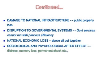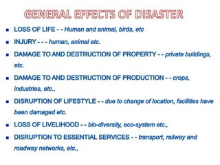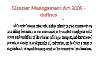 This document discusses several natural disasters that have impacted India such as earthquakes, floods, cyclones, and fires. It defines a disaster as an event that causes widespread damage and loss of life, exceeding local coping abilities. Disaster management is important for preventing loss of life and property damage. India is highly vulnerable to natural disasters due to its geography and climate. Effective disaster management requires assessing risk, reducing vulnerability and building capacity for preparedness, response and recovery.
