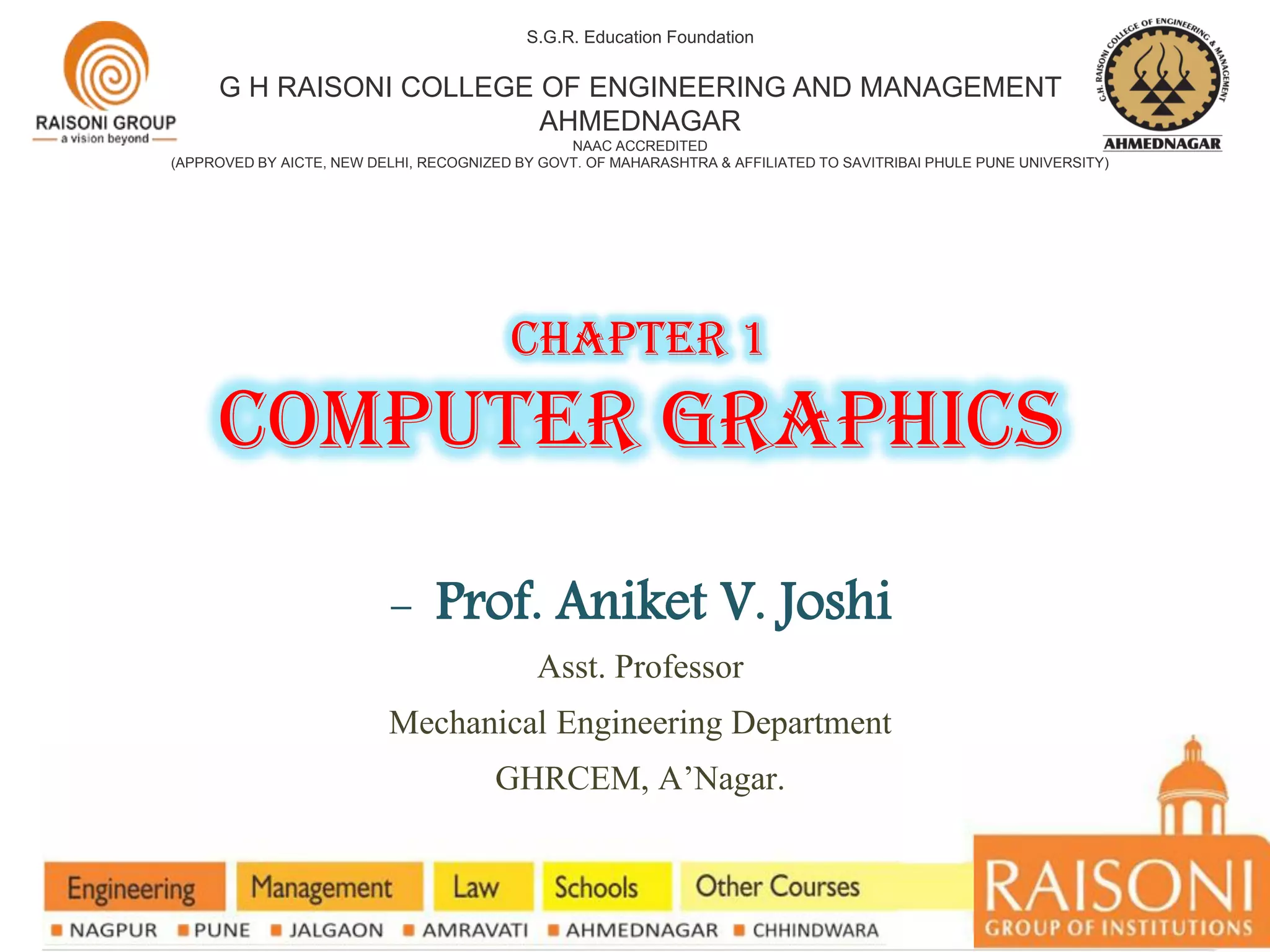 The document provides an introduction to computer graphics, focusing on computer-aided design (CAD) and interactive computer graphics. It covers various geometric transformations such as translation, rotation, scaling, reflection, and shear, including their applications and limitations. Additionally, the text discusses homogeneous coordinates, mapping of geometric models, and the types of projections needed to display 3D objects in 2D form.