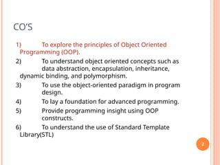 This document outlines the principles and fundamentals of Object-Oriented Programming (OOP) including key concepts such as data abstraction, encapsulation, inheritance, dynamic binding, and polymorphism. It discusses various programming techniques, compares procedural and object-oriented programming, and introduces the C++ programming language as a versatile tool that supports these paradigms. The document serves as a comprehensive guide for understanding OOP and its implementation in C++.