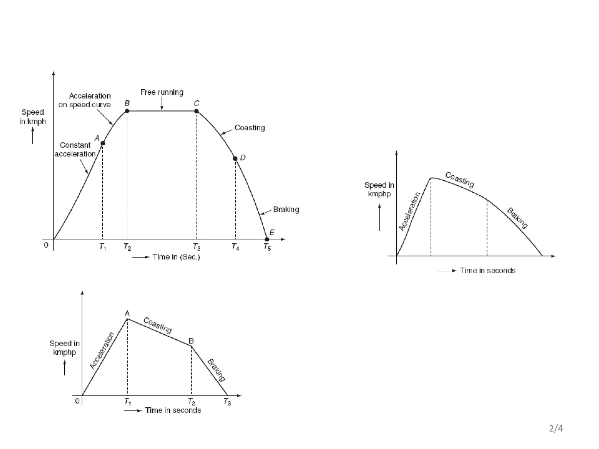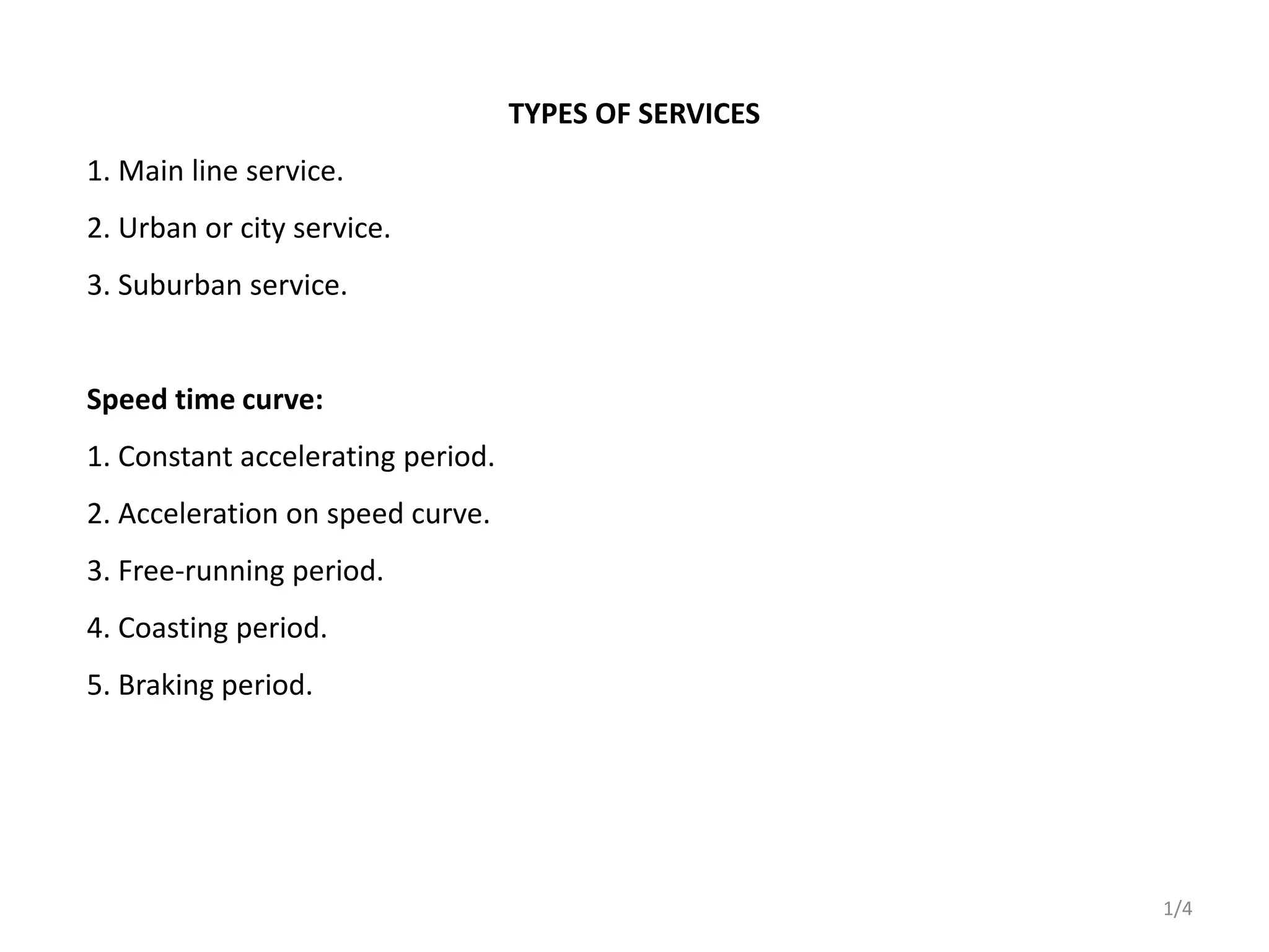 The document discusses different types of train services and their characteristics, including main line, urban, and suburban services. It covers essential concepts related to train speed, braking systems (both electric and mechanical), tractive effort, and specific energy consumption, emphasizing the advantages and disadvantages of electric braking. Additionally, it outlines various factors that affect the schedule speed and energy consumption of trains.