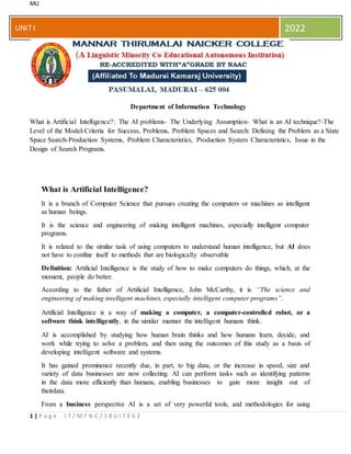 The document discusses artificial intelligence (AI) and provides definitions, techniques, branches, and applications of AI. It defines AI as creating intelligent machines, especially computer programs, that can think like humans. It discusses representing knowledge to solve problems as an AI technique. Some branches of AI mentioned are logical AI, search, pattern recognition, representation, inference, common sense reasoning, learning from experience, planning, and applications in fields like robotics, natural language processing, and game playing.